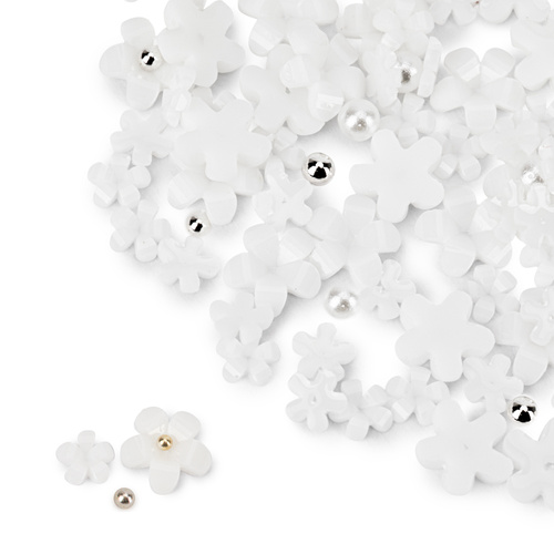 - Zestaw zawiera ok. 150 sztuk akrylowych kwiatków białe + kulki dekoracyjne.